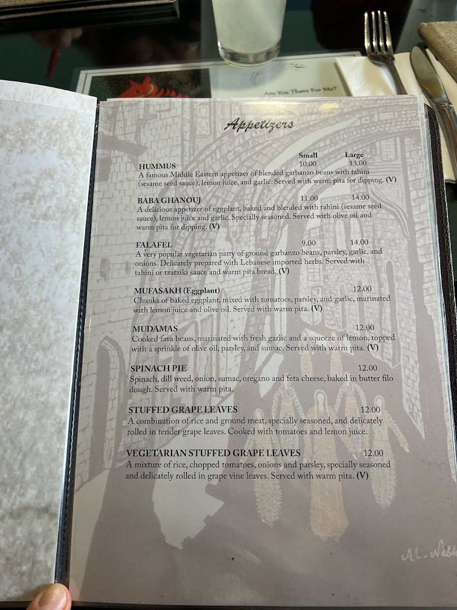 The menu is a delightful dive into Middle Eastern cuisine, featuring: